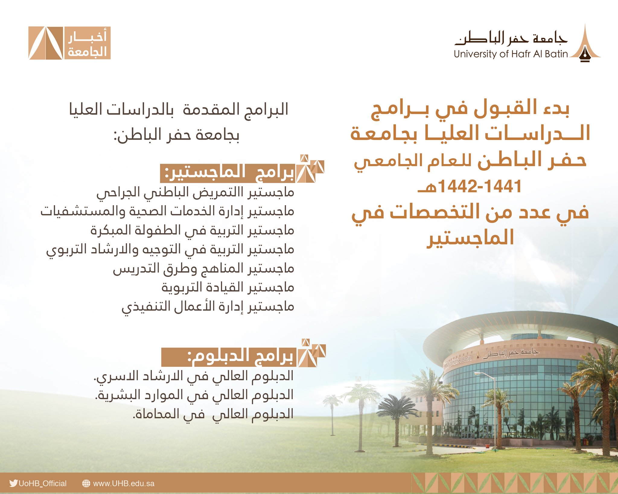 جامعة حفر الباطن جامعة سعودية حكومية تقع في محافظة حفر الباطن التي تتبع المنطقة الشرقية شرق المملكة العربية السعودية، أنشئت الجامعة بناءً على موجب المرسوم الملكي رقم (20937) وتاريخ 2 جمادى الآخرة 1435 هـ الموافق 3 أبريل 2014. جامعة حفر الباطن تُعلن عن بدء استقبال طلبات الالتحاق بالجامعة للعام الجامعي القادم 1443 هـ 16/12/1442. أن يكون المتقدم سعودي الجنسية أو من أم سعودية. The latest tweets from @uohb_official وظائف جامعة حفر الباطن 1442 تم الإعلان عنها حديثًا من قبل الجامعة وأوضحت كل التخصصات التي تريدها كما ذكرت عدة شروط هامة في الفرد الذي سوف يتقدم للوظيفة ولهذا سوف نطلعكم على أهم المعلومات حول الموضوع من خلال المقال التالي. جامعة حفر الباطن تقر آلية تنفيذ الاختبارات الرئيسية والنهائية للفصل الأول. جامعة حفر الباطن تعلن عن وظائف شاغرة للسعوديين. مرحبا بكم أهلاً بكم في بوابة القبول للعام الجامعي 1443 هـ تقديم طلب جديد استعراض طلب سابق شروط وضوابط القبول نتائج ونسب القبول. أن يجتاز المتقدم الفحص الطبي. أعلنت جامعة حفر الباطن مُمثلة في عمادة الدراسات العليا فتح القبول في 7 برامج ماجستير للعام الجامعي 1443هـ، وذلك وفقاً للتفاصيل الموضحة أدناه. تسجيل الدخول إلى oracle peoplesoft. تخصصات جامعة حفر الباطن للبنات ونسب القبول 1443، حيث هناك كثير من الطالبات خريجات الثانوية العامة الذين يريدون التسجيل في جامعة حفر الباطن، ولكنهم يبحثون عن التخصصات التي تقدمها الجامعة، والنسب الخاصة بالقبول في كل. جامعة حفر الباطن توفر وظائف أكاديمية شاغرة للجنسين لحملة الدكتوراه 1443هـ.